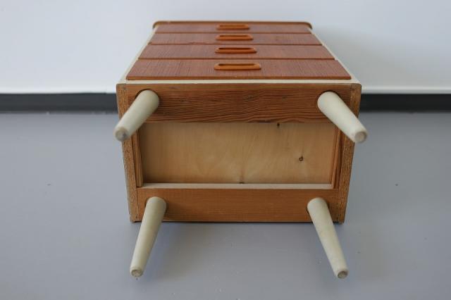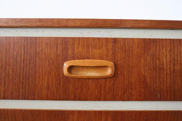 スウェーデンから届いたコンパクトな4段チェスト。スウェーデンチークと白にペイントされたデザインの組み合わせがなんとも目を惹きます。小振りなサイズなので狭いスペースにも置きやすく、小物の整理整頓にも重宝するタイプの家具です。