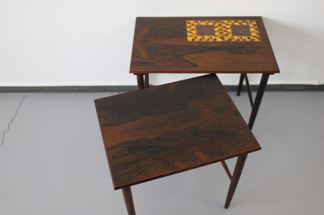 北欧デンマーク製のネストテーブルです。ネストとは「入れ子」の意味があることばで、大きなサイズのテーブルに小さなサイズのテーブルがきれいに収まるつくりの家具です。ワンポイントのタイルがデザインのポイント。力強いローズウッドの木目も雰囲気が出ます。