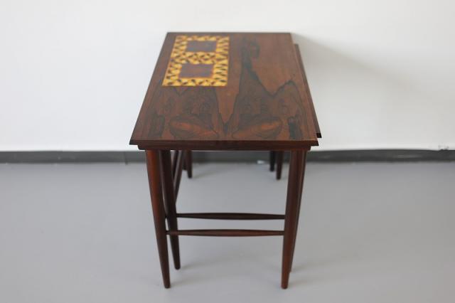 北欧デンマーク製のネストテーブルです。ネストとは「入れ子」の意味があることばで、大きなサイズのテーブルに小さなサイズのテーブルがきれいに収まるつくりの家具です。ワンポイントのタイルがデザインのポイント。力強いローズウッドの木目も雰囲気が出ます。