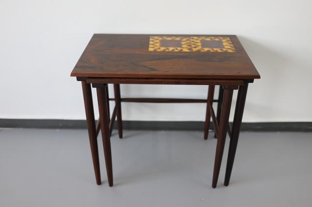 北欧デンマーク製のネストテーブルです。ネストとは「入れ子」の意味があることばで、大きなサイズのテーブルに小さなサイズのテーブルがきれいに収まるつくりの家具です。ワンポイントのタイルがデザインのポイント。力強いローズウッドの木目も雰囲気が出ます。