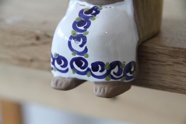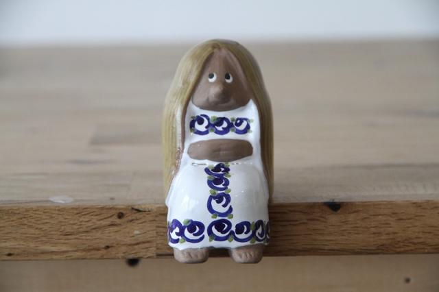 白地にブルーの爽やかな模様が映える、ワンピースを着た女の子の陶器人形です。