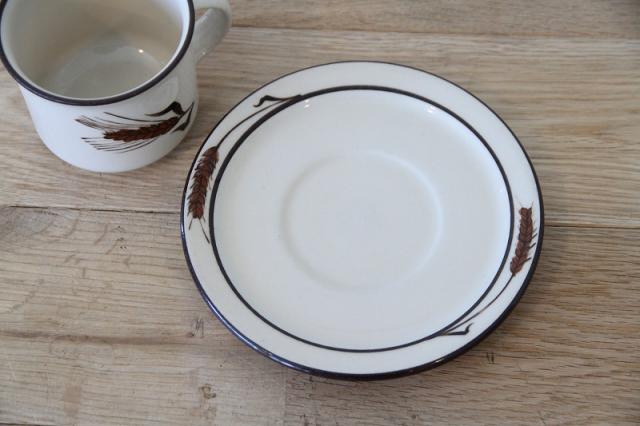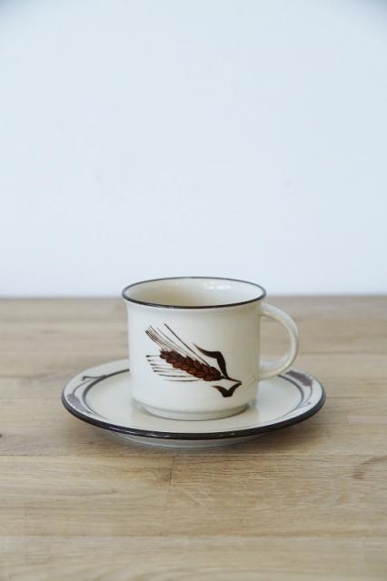 1970年代に製造されたカップ&ソーサーで、ベージュ掛かったベースに実りの季節を思わせるハンドペイントの麦の穂がアクセントになっています。