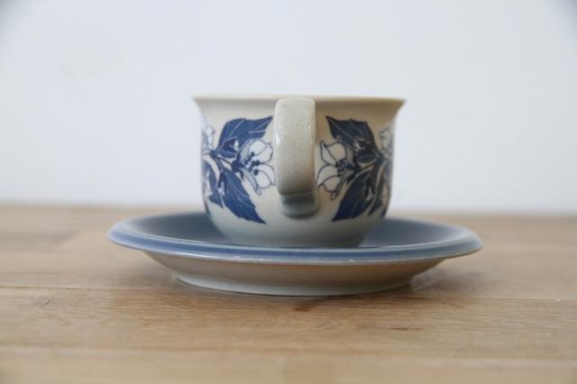 ブルーグレーのソーサーに、同一色の野花がカップにプリントされた落ち着きのある大人っぽい雰囲気のカップ&ソーサー。
