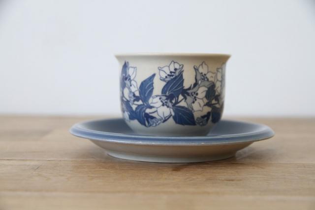 ブルーグレーのソーサーに、同一色の野花がカップにプリントされた落ち着きのある大人っぽい雰囲気のカップ&ソーサー。