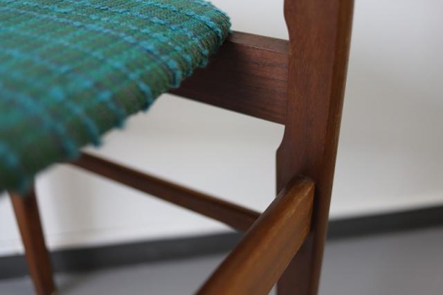 北欧デンマーク買付で出会った1960-70年代製のダイニングチェア。凹凸感ある織り生地の質感とブルーグリーンの鮮やかな色がとても印象的です。フレームの細かなディテールも大変美しく、どこから見ても満足できる一脚ではないでしょうか。