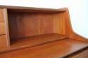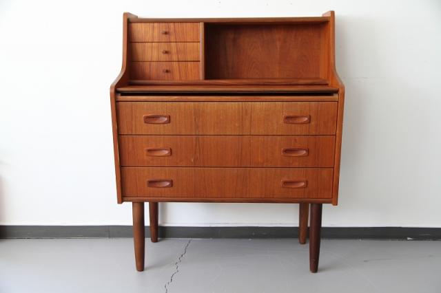 北欧デンマーク買付のライティングビューローです。ビューローとは、書棚や引き出しなどの収納家具とデスクが一体化した家具のことをいいます。これは天板を手前に引き出すことでデスクとして使用することが出来るタイプのデザインです。その天板を持ち上げると鏡が付いている仕様です。